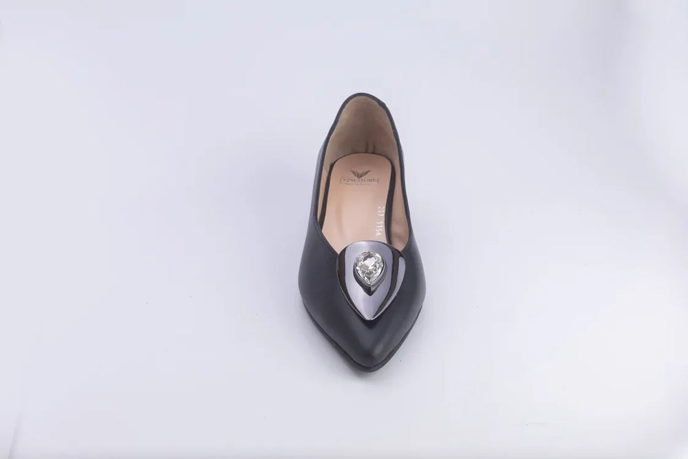 Elevate your every step with Vincitore’s nude pointed-toe pumps - a perfect harmony of minimalist elegance and standout luxury. Crafted in supple calfskin and adorned with a signature black chrome teardrop embellishment topped with a faceted crystal, this pair balances clean lines with sculptural glamour.